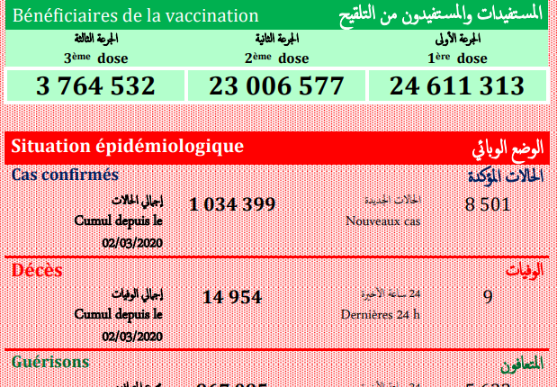 وأشارت النشرة إلى أن الحصيلة الجديدة للإصابات بالفيروس رفعت العدد الإجمالي لحالات الإصابة المؤكدة بالمملكة إلى مليون و34 ألف و399 حالة منذ الإعلان عن أول حالة في 2 مارس 2020، فيما بلغ مجموع حالات الشفاء التام 967 ألف و95 حالة بنسبة تعاف تبلغ 5، 93 في المائة، فيما بلغ عدد الوفيات 14 ألف و954 بنسبة فتك تصل إلى 4، 1 في المائة.