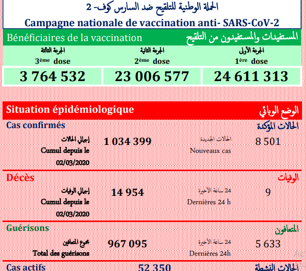 تسجيل “09 من الوفيات” و 8501 إصابة جديدة بفيروس (كوفيد-19) فيما بلغ عدد المتعافين5633 شخصا خلال الـ24 ساعة الماضية