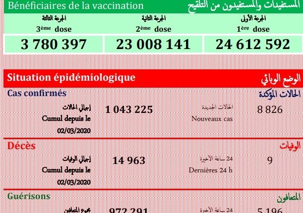 تسجيل “09 من الوفيات” و 8826 إصابة جديدة بفيروس (كوفيد-19) فيما بلغ عدد المتعافين5196 شخصا خلال الـ24 ساعة الماضية