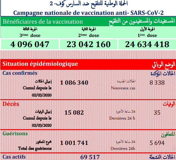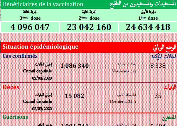 فيروس (كوفيد-19): تسجيل “35 من الوفيات” و 8338 إصابة جديدة فيما بلغ عدد المتعافين5694 شخصا خلال الـ24 ساعة الماضية