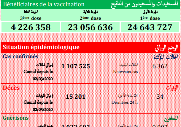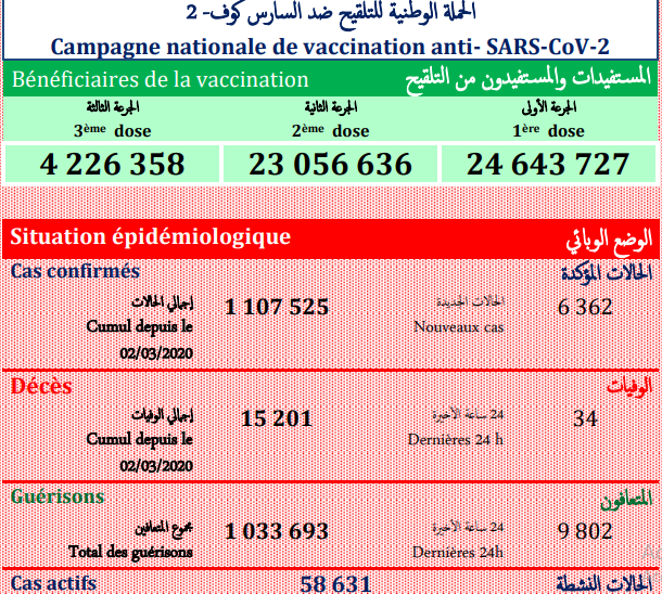 فيروس (كوفيد-19): تسجيل “34 من الوفيات” و 6362 إصابة جديدة فيما بلغ عدد المتعافين 9802 شخصا خلال الـ24 ساعة الماضية