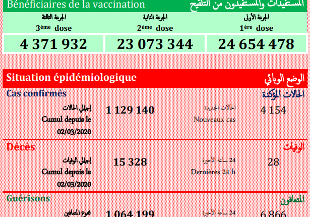 وأبرزت الوزارة، في النشرة اليومية لحصيلة (كوفيد-19)، أن 4 ملايين و510 آلاف و819 شخصا تلقوا الجرعة الثالثة من اللقاح المضاد للفيروس، فيما ارتفع عدد الملقحين بالجرعة الثانية إلى 23 مليون و84 ألفا و796 شخصا، مقابل 24 مليون و662 ألفا و706 شخصا تلقوا الجرعة الأولى.
