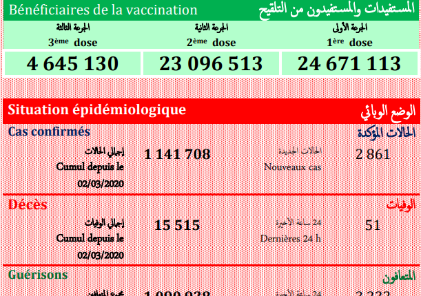وأشارت النشرة إلى أن الحصيلة الجديدة للإصابات بالفيروس رفعت العدد الإجمالي لحالات الإصابة المؤكدة بالمملكة إلى مليون و141 ألفا و708 حالات منذ الإعلان عن أول حالة في 2 مارس 2020، فيما بلغ مجموع حالات الشفاء التام المليون و90 ألفا و938 حالة بنسبة تعاف تبلغ 95.6 في المائة، فيما بلغ عدد الوفيات 15 ألفا و515 بنسبة فتك تصل إلى 1,4 في المائة.