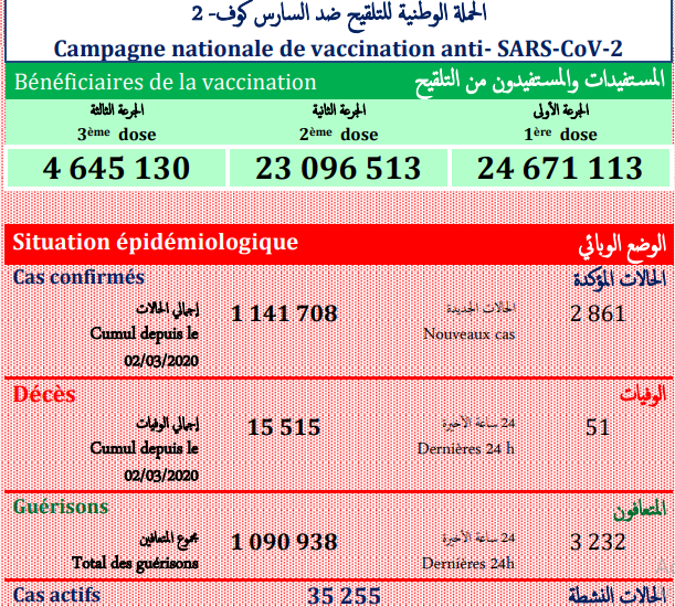 (كوفيد-19): تسجيل 2861 إصابة وبلغ عدد المتعافين 3232 شخصا فيما تم تسجيل 51 وفاة خلال الـ 24 ساعة الماضية