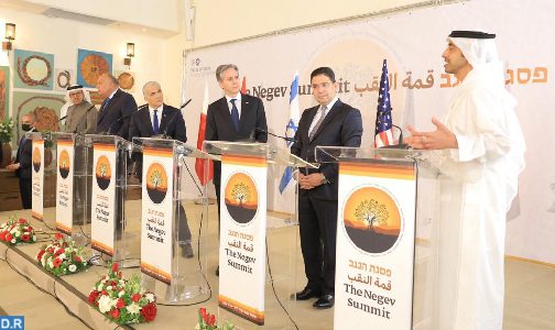 دعا وزير الشؤون الخارجية والتعاون الإفريقي والمغاربة المقيمين بالخارج، السيد ناصر بوريطة، لضرورة بناء دينامية جديدة للسلام واتخاذ خطوات ملموسة تفتح آفاقا واعدة لكافة شعوب منطقة الشرق الأوسط. وقال السيد بوريطة اليوم الاثنين في مؤتمر صحفي مشترك عقب القمة الدبلوماسية، التي جمعت على مدى يومين بالنقب جنوب إسرائيل، وزراء خارجية الولايات المتحدة وإسرائيل والمغرب والبحرين ومصر والإمارات،”يتعين علينا بناء دينامية وفق خطوات ملموسة تشعر بها الشعوب وتساهم في تحسين حياة العالم وتفتح، فضلا عن ذلك، آفاقا واعدة لشباب ولشعوب منطقتنا”.