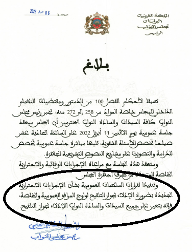 وأشار البلاغ إلى أنه، وتنفيذا لقرارات السلطات العمومية بشأن الإجراءات الاحترازية الجديدة بضرورة الإدلاء بجواز التلقيح لولوج المرافق العمومية والخاصة، فإنه يتعين على جميع السيدات والسادة النواب الإدلاء بهذا الجواز.