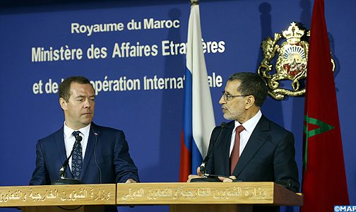 وأعرب ميدفيديف، في كلمة ألقاها خلال جلسة عمل موسعة ترأسها إلى جانب رئيس الحكومة السيد سعد الدين العثماني وحضرها عدد من المسؤولين المغاربة وأعضاء الوفد الروسي، عن ارتياحه لكون هذه الشراكة الاستراتيجية، التي تعززت منذ الزيارة الأولى لصاحب الجلالة الملك محمد السادس لروسيا سنة 2002 ، تتطور “على أسس ثابتة ومتينة”.