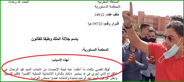 قضت المحكمة الدستورية في ملف  ملف عدد: 12/149 قــرار رقـم: 22/197م.أ، بالغاء انتخاب محمد الرجدال في الاقتراع الذي جرى يوم 8 شتنبر 2021، بالدائرة الانتخابية كلميم، اقليم كلميم ، وتعلن عن فوز السيد عبد الرحيم بوعيدة ، وانتخابه عضوا بمجلس النواب.