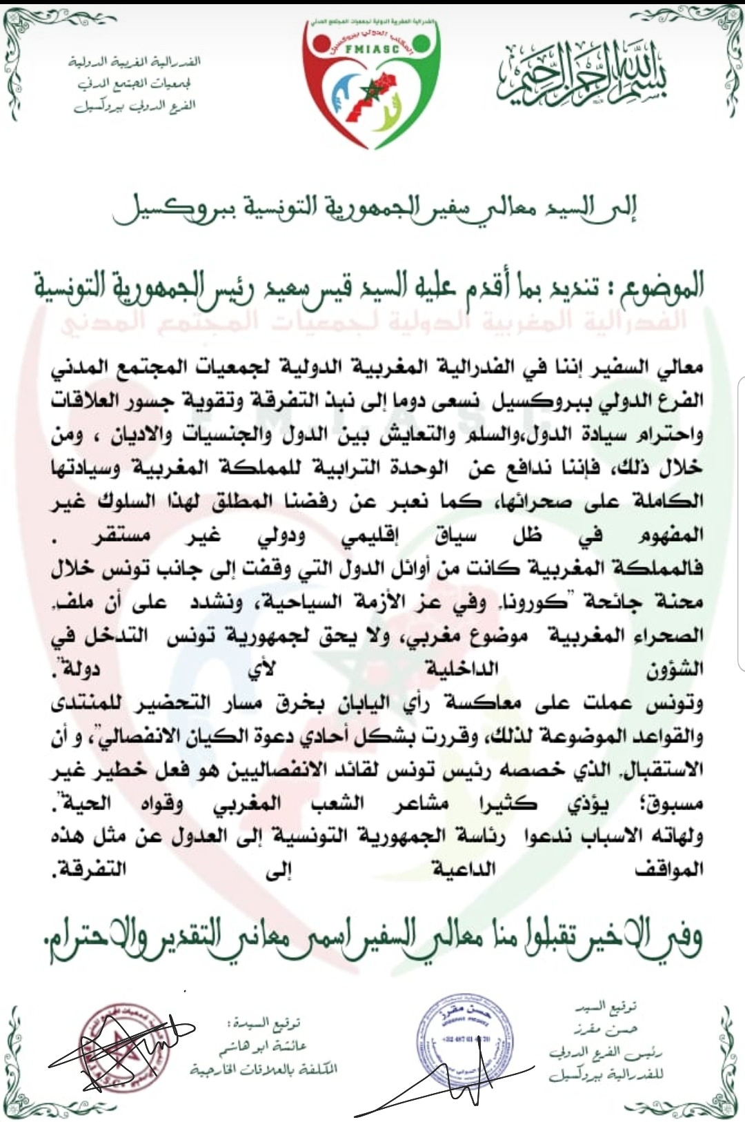 رسالة مفتوحة من الفدرالية المغربية الدولية لجمعيات المجتمع المدني ـ الفرع الدولي ببروكسيل ـ الى سفير الجمهورية التونسية ببروكسيل