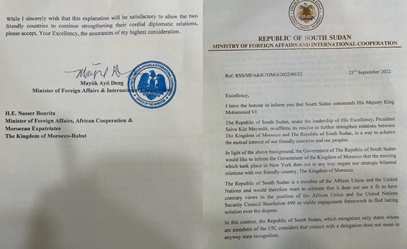 وأوضح وزير الشؤون الخارجية والتعاون الدولي بجنوب السودان، ماييك أيي دينغ، في رسالة رسمية موجهة إلى وزير الشؤون الخارجية والتعاون الإفريقي والمغاربة المقيمين بالخارج، ناصر بوريطة، وتم تعميمها بنيويورك، أن جمهورية جنوب السودان “تعترف فقط بالدول الأعضاء في الأمم المتحدة”.