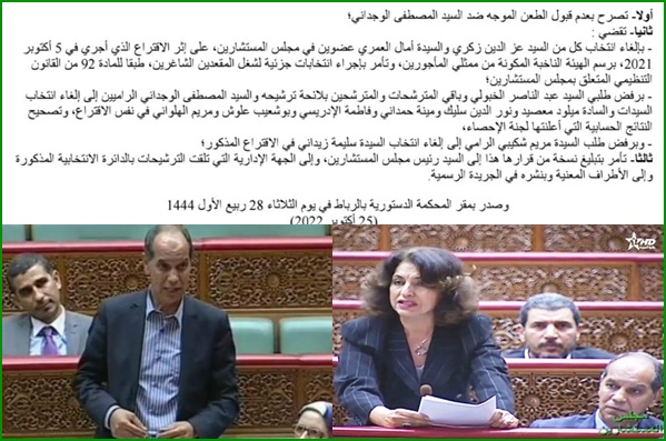 وبعد الدراسة والبحث في جميع الحيثيات، من طرف المحكمة الدستورية، اصدرت يوم الثلاثاء 28 ربيع الاول 1444 الموافق لـ 25 اكتوبر الماضي 2022  قرارا نهائيا  تحت رقم 22/200م.ا، يقضي بالغاء انتحاب كل من امال العمري وعزالدين زكري وتامر باجراء انتخابات جزئية لشغل المقعدين الشاغرين ، طبقا للمادة 92 من القانون التنظيمي المتعلق بمجلس المستشارين.