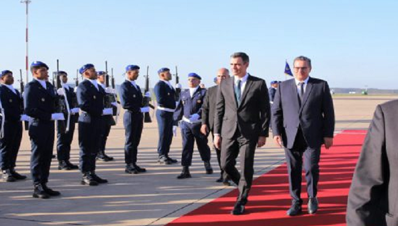 وبعد أن استعرض وحدة تابعة للقاعدة الجوية الملكية الأولى، التي أدت التحية، تقدم للسلام على رئيس الحكومة الاسبانية كل من وزير الصحة والحماية الاجتماعية، ووزير الفلاحة والصيد البحري والتنمية القروية والمياه والغابات، ووزير النقل واللوجيستيك، ووزير الشباب والثقافة والتواصل، ووالي جهة الرباط – سلا – القنيطرة، وسفيرة المغرب بمدريد. وتقدم للسلام على السيد أخنوش، عن الجانب الإسباني على الخصوص، وزيرا الداخلية والخارجية وسفير إسبانيا بالرباط.