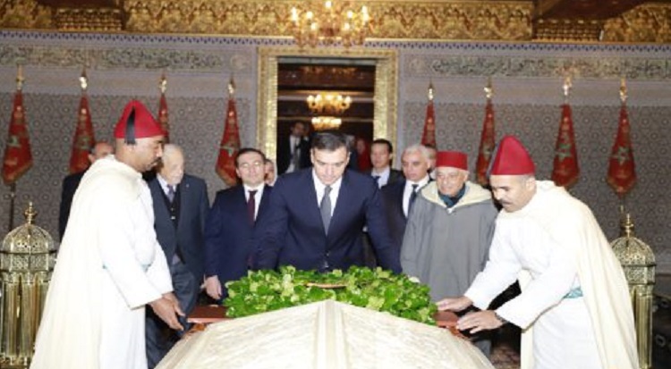 ووضع السيد سانشيز إكليلا من الزهور على قبري الملكين الراحلين، وترحم على روحيهما الطاهرة قبل أن يوقع في الدفتر الذهبي للضريح.