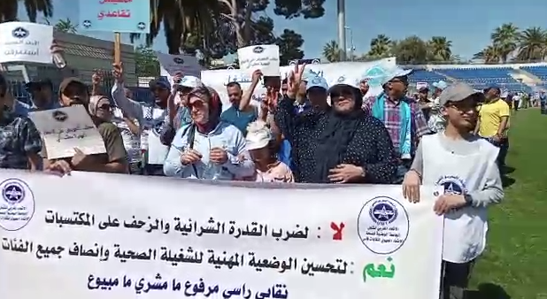 وقد رددت الطبقة العاملة شعارات تدين الوضع المعيشي الذي أصبح يعيشه المواطن في ظل أزمة ارتفاع الأسعار، حيث نظمت نقابة “مخاريق” مسيرة  انطلقت من الموقع المذكور في اتجاه شوارع المدينة داعية الجماهير بالانخراط في المسيرة التي تعبر على دعم الطبقة العاملة التي تمثل مختلف القطاعات والدفاع عن حقوقهم، رفع خلالها العمال شعارات منددة بالتضييق الذي تمارسه الحكومة على العمل النقابي، وأخرى مطالبة بإنصاف الطبقة العاملة ورفع الحيف الممارس عليها.