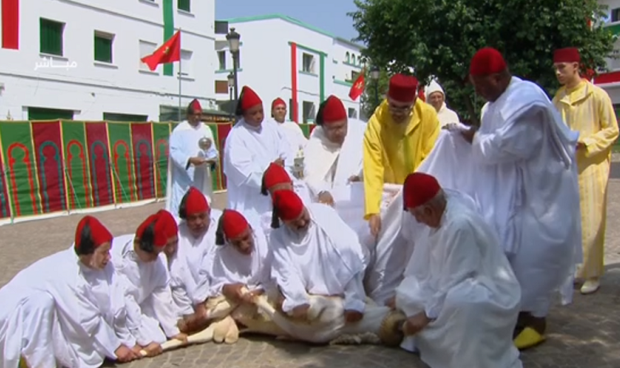 بعد ذلك، قام جلالة الملك بنحر أضحية العيد اقتداء بسنة جده المصطفى عليه أزكى الصلاة والسلام، فيما قام إمام المسجد بنحر الأضحية الثانية.