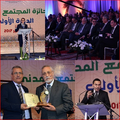 نظمت الوزارة المنتدبة لدى رئيس الحكومة المكلفة بالعلاقات مع البرلمان والمجتمع المدني الناطق الرسمي باسم الحكومة، مساء امس الأربعاء 15 نونبر 2017 بالرباط، حفل تسليم جائزة المجتمع المدني في دورتها الأولى، حضره السيد رئيس الحكومة وعدد من الوزراء وبرلمانيون وشخصيات سياسية، ومسؤولو وممثلو عدد من المؤسسات العمومية، وشخصيات فكرية وفنية وإعلامية، وممثلو جمعيات المجتمع المدني.