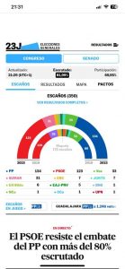 وجاء الحزبان الرئيسيان في إسبانيا، وفقا لهذه النتائج، متبوعين بحزب فوكس اليميني المتطرف بحصوله على 12.40 بالمائة من الأصوات (33 مقعدا)، والحزب اليساري المتطرف سومار بحصوله على 12.29 بالمائة من الأصوات (31 مقعدا).