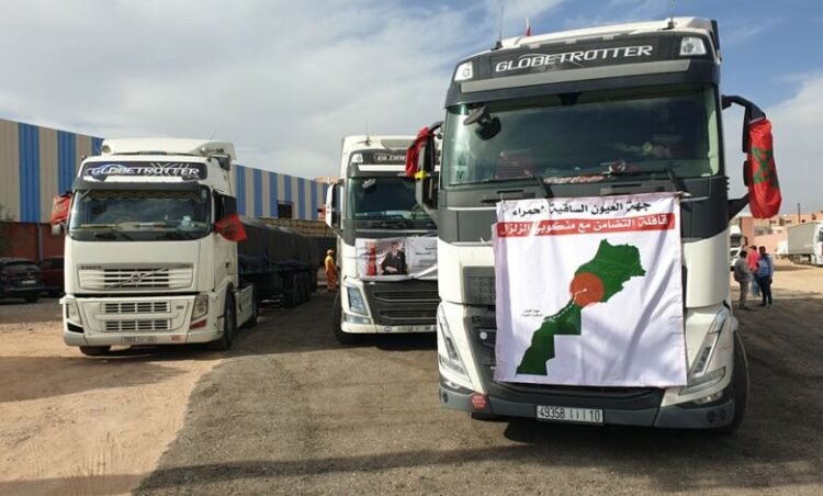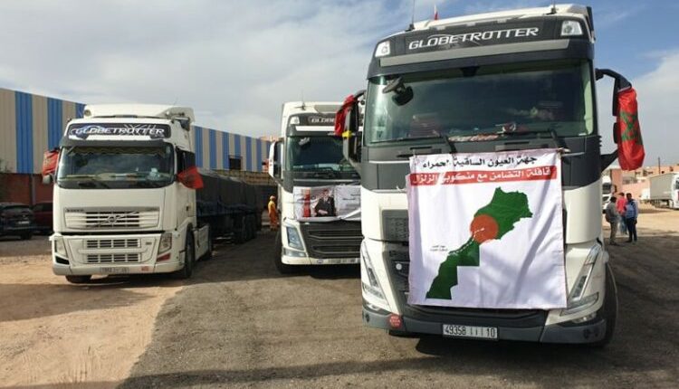 وهكذا، شد ما لا يقل عن 80 شاحنة الرحال صوب مراكش مزينة بعناية بالأعلام الوطنية، وصور صاحب الجلالة وخريطة المغرب، وهي محملة بالمواد الغذائية والمساعدات الإنسانية (من خيام، وأفرشة، وأغطية، وملابس وغيرها)، في سلسلة غير مسبوقة من التضامن والتآزر، عبر طريق “الأمل والتفاؤل”، انطلاقا من مدن العيون وبوجدور والسمارة وطرفاية، تحت شعار: “مهما قست الظروف، فإن المغرب، الفخور بملكه، وبقواه الحية، سيبقى موحدا إلى الأبد، ومتحدا من الشمال إلى الجنوب ومن الشرق إلى الغرب”.