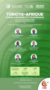 ينظم مجلس العلاقات الاقتصادية الخارجية التركي (DEİK)،  النسخة الرابعة لمنتدى الأعمال التركي-الأفريقي (TABEF) في بمركز اسطنبول للمؤتمرات، يومي 12 و13 من أكتوبر2023، تحت شعار : : “التحديات والفرص: شراكات اقتصادية أقوى بين تركيا وأفريقيا”، وذلك برعاية وزارة التجارة التركية، وبتنسيق مع الإتحاد الأفريقي.