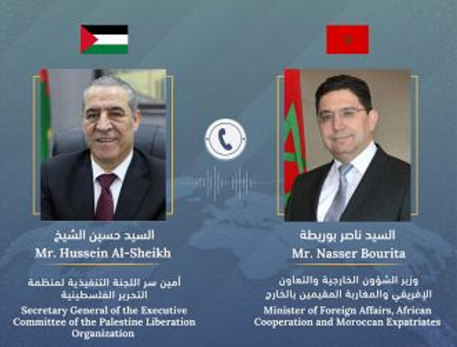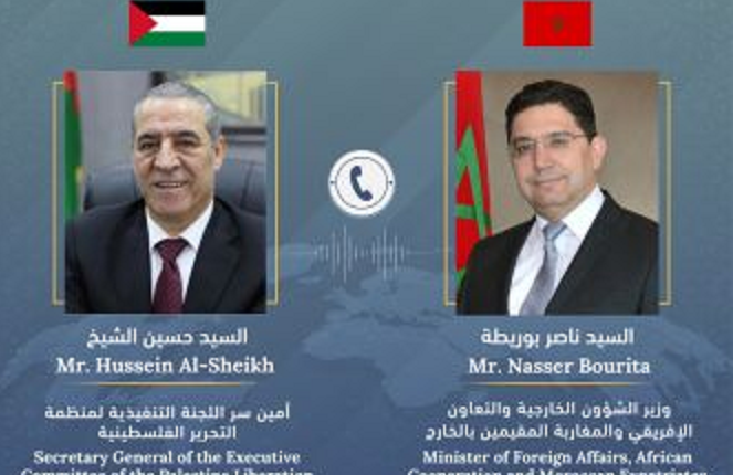 أجرى وزير الشؤون الخارجية والتعاون الإفريقي والمغاربة المقيمين بالخارج، ناصر بوريطة، امس الأحد 15 أكتوبر 2023، اتصالا هاتفيا، مع أمين سر اللجنة التنفيذية لمنظمة التحرير الفلسطينية، حسين الشيخ.