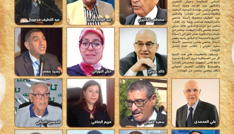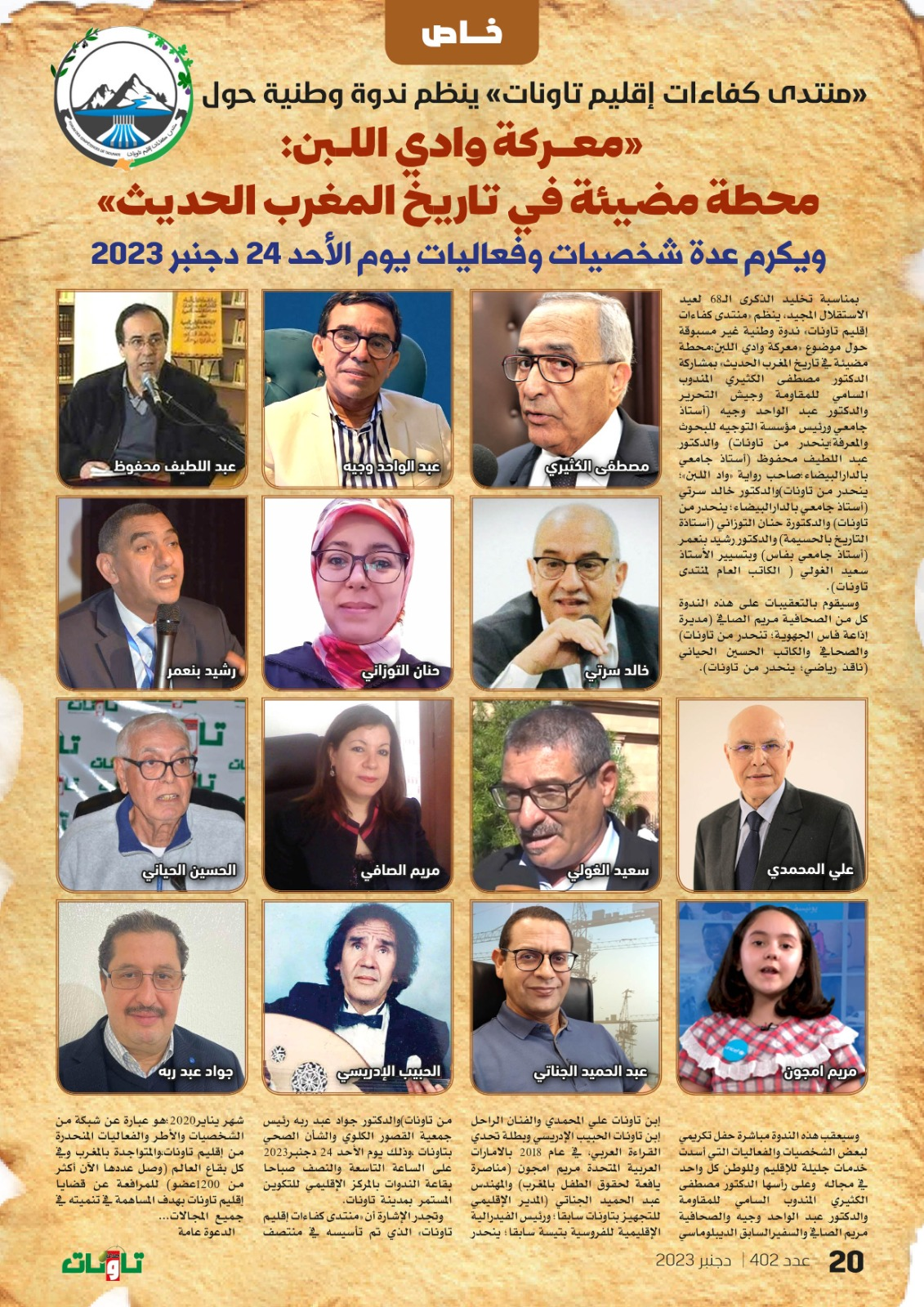 بمناسبة تخليد الذكرى الـ68 لعيد الاستقلال المجيد،ينظم “منتدى كفاءات إقليم تاونات” ندوة وطنية غير مسبوقة حول موضوع “معركة وادي اللبن:محطة مضيئة في تاريخ المغرب الحديث” بمشاركة الدكتور مصطفى الكثيري المندوب السامي للمقاومة وجيش التحريروالدكتور عبد الواحد وجيه (أستاذ جامعي ورئيس مؤسسة التوجيه للبحوث والمعرفة؛ ينحدر من تاونات) والدكتور عبد اللطيف محفوظ (أستاذ جامعي بالدارالبيضاء؛صاحبرواية “واد اللبن”؛ينحدر من تاونات)والدكتور خالد سرتي (أستاذ جامعي بالدارالبيضاء؛ينحدر من تاونات) والدكتورة حنان التوزاني (أستاذة التاريخ بالحسيمة) والدكتور رشيد بنعمر(أستاذ جامعي بفاس)وبتسيير الأستاذ سعيد الغولي ( الكاتب العام لمنتدى تاونات).