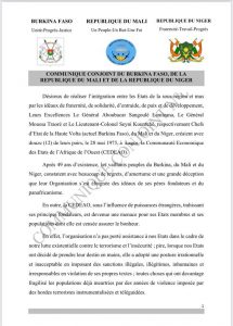 وذكر البيان المشترك، الذي تلي على وسائل الإعلام الرسمية لهذه الدول الثلاث، أن قادة الدول الثلاث الواقعة في غرب إفريقيا “مع تحملهم كافة مسؤولياتهم أمام التاريخ واستجابة لانتظارات وانشغالات وتطلعات شعوبهم، يقررون بسيادة كاملة الانسحاب الفوري لبوركينا فاسو ومالي والنيجر من المجموعة الاقتصادية لدول غرب إفريقيا”.
