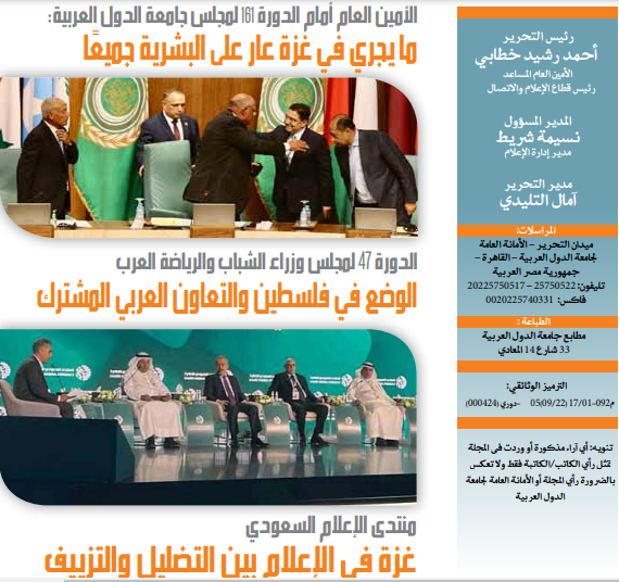 كما تطرقت المجلة الى ما اسفرت عنه الدورة 181 للمجلس، والتي خصصت للاعتداء الشنيع، والتقتيل الهمجي في حق ساكنة غزة المحتلة العزل ، والدمار الشامل للقطاع من طرف اسرائيل امام مرأى ومسمع العالم ، اضافة الى ما اسفرت عنه الدورة 47 لوزراء الشباب والرياضة العرب، التي تناولت بدورها الوضع في فلسطين والتعاون العربي المشترك، وملفات اخرى ذات راهمية.