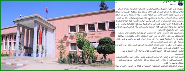 و جاء في مقال لرئيس الجمعية محمد الغلوسي، نشر على صفحته الفايسبوكية :” سبق لنا في الفرع الجهوي مراكش الجنوب للجمعية المغربية لحماية المال العام ان تقدمنا بشكاية إلى الوكيل العام للملك لدى محكمة الإستئناف بمراكش حول شبهة تبديد العقار العمومي بالجهة تحت ذريعة الإستثمار وتفويت العقار العمومي لشخصيات سياسية ومنعشين عقاريين بثمن رمزي وذلك بتوظيف ماسمي بلجنة الإستتناءات التي كان يرأسها الوالي الأسبق عبد الفتاح البجيوي