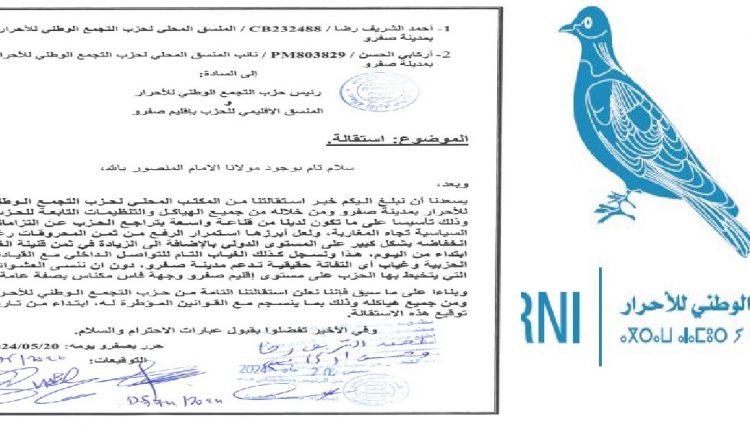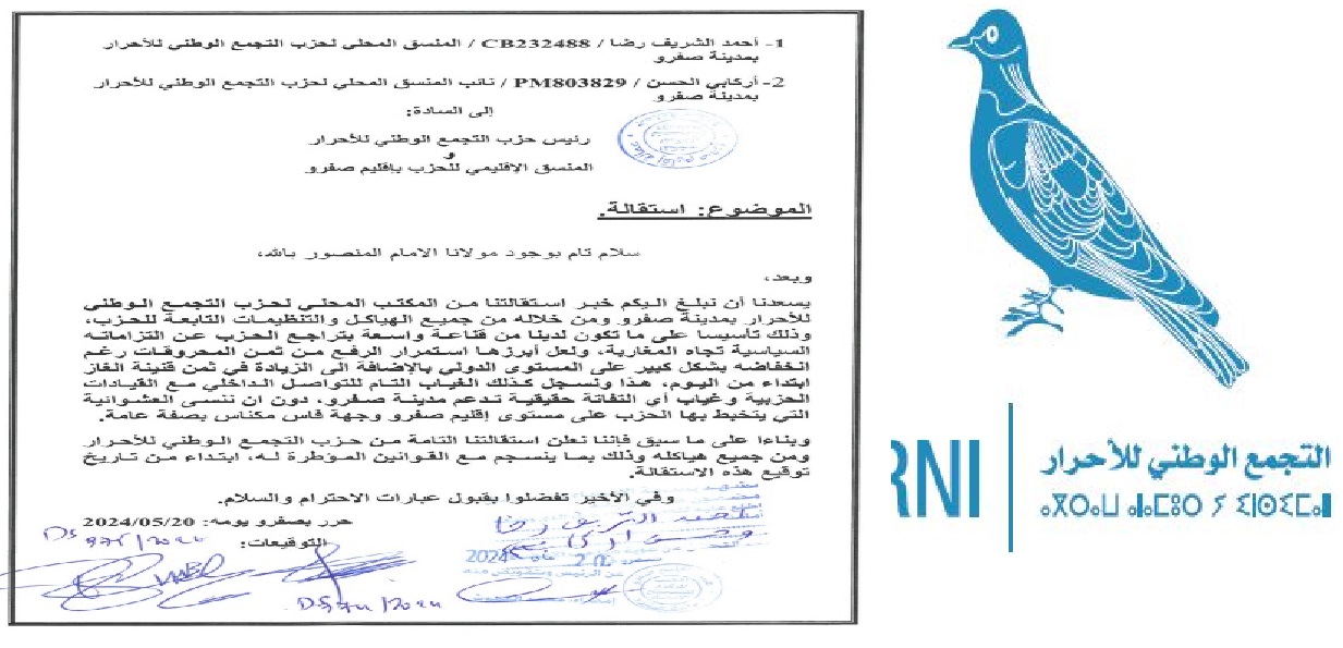 المنسق المحلي لحزب التجمع الوطني للاحرارونائبة بمدينة صفرو.. يقدمان استقالتهما من حزب “الحمامة” ومن جميع هياكل الحزب