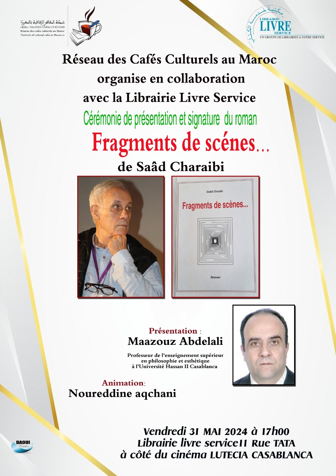 في إطار أنشطتها الثقافية للموسم الثقافي /الجمعوي الحالي ، تنظم شبكة المقاهي الثقافية بالمغرب بتنسيق مع مكتبة خدمة الكتاب بالبيضاء حفل تقديم وتوقيع كتاب ” Fragements de scénes ” للكاتب والمخرج السينمائي سعد الشرايبي ، وذلك يوم الجمعة31ماي 2024 على الساعة الخامسة والنصف مساء بمكتبة ” livre service ” زنقة طاطا بجوار سينما luetcia بمدينة الدار البيضاء .