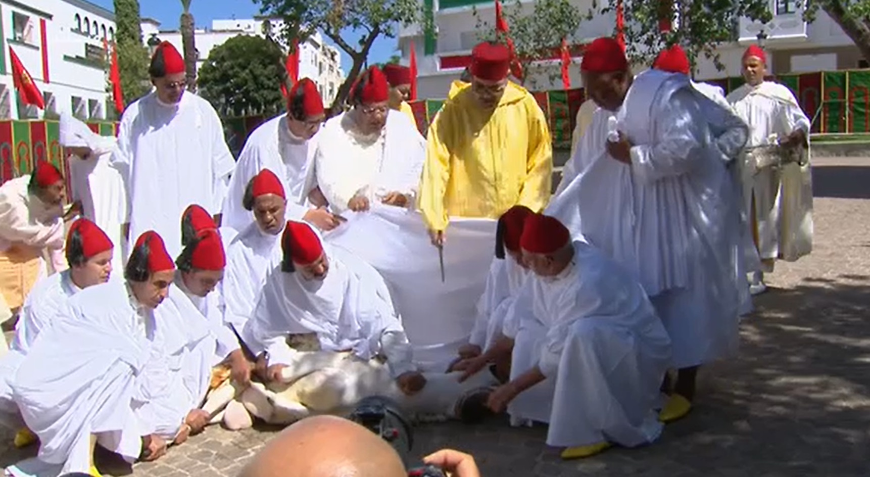 بعد ذلك، قام جلالة الملك بنحر أضحية العيد اقتداء بسنة جده المصطفى عليه أزكى الصلاة والسلام، فيما قام إمام المسجد بنحر الأضحية الثانية.