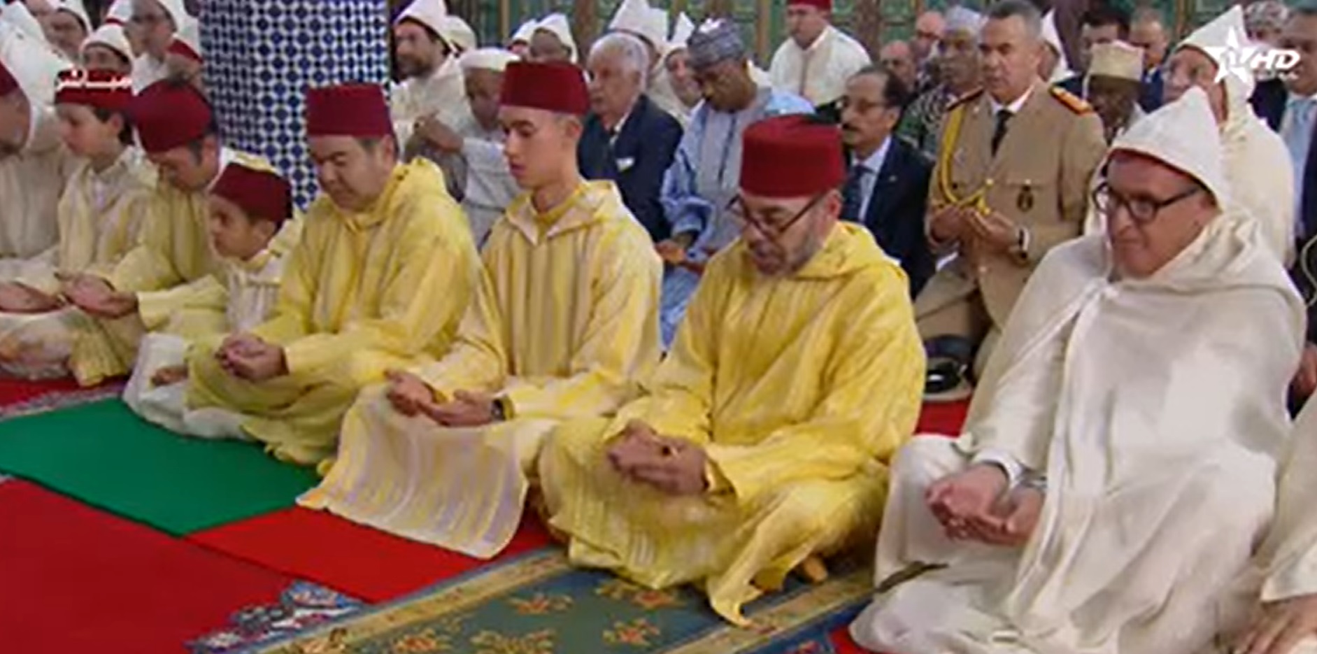 وبالقصر الملكي، تقدم للسلام على أمير المؤمنين صاحب الجلالة الملك محمد السادس، أيده الله، الذي كان مرفوقا بصاحب السمو الملكي ولي العهد الأمير مولاي الحسن وصاحب السمو الملكي الأمير مولاي رشيد وصاحب السمو الأمير مولاي أحمد، وتهنئته بالعيد السعيد رئيس الحكومة، ورئيسا غرفتي البرلمان، والرئيس المنتدب للمجلس الأعلى للسلطة القضائية الرئيس الأول لمحكمة النقض، ورئيس النيابة العامة الوكيل العام للملك لدى محكمة النقض، وعميد السلك الدبلوماسي الإسلامي بالمغرب سفير دولة الكاميرون، ورؤساء الهيئات الدستورية وعدد من سامي الشخصيات المدنية والعسكرية.