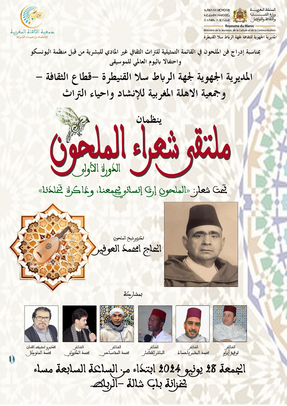 إحتفاء بإدراج فن الملحون تراثا ثقافيا غير مادي ، واحتفالا باليوم العالمي للموسيقى ، تنظم جمعية الأهلة المغربية للإنشاد وإحياء التراث ، والمديرية الجهوية للثقافة لجهة الرباط سلا القنيطرة ، الدورة الأولى لملتقى شعراء الملحون تحت شعار ” الملحون إرث إنساني يجمعنا ، وذاكرة تخلدنا ” وذلك يوم غد الجمعة 28يونيو 2024 إبتداء من الساعة السابعة مساء لخزانة باب شالة بالرباط …