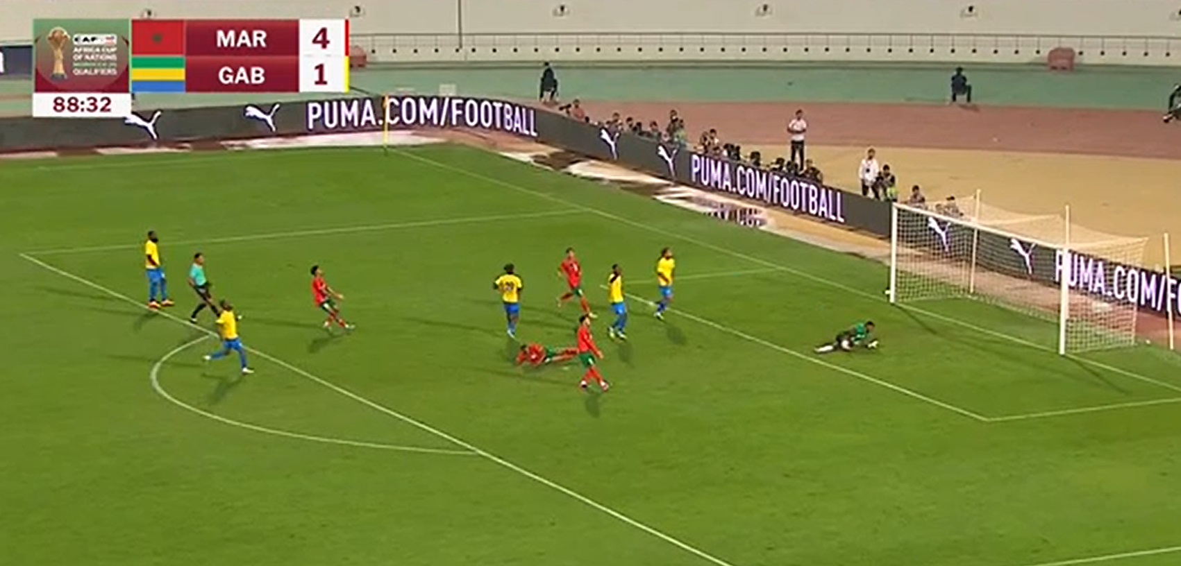 وسجل أهداف المنتخب المغربي كل من حكيم زياش (د 10 ض ج، ود26 ض ج) وبراهيم دياز (د 59) وأيوب الكعبي (د 82)، فيما وقع للغابون بيير إيميريك أوباميانغ (د 40 ض ج).