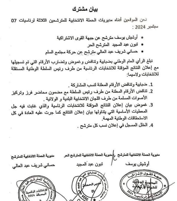 “نحن الموقعين ادناه، مديريات الحملة الانتخابية للمترشحين الثلاث لرئاسيات 07 سبتمبر 2024: