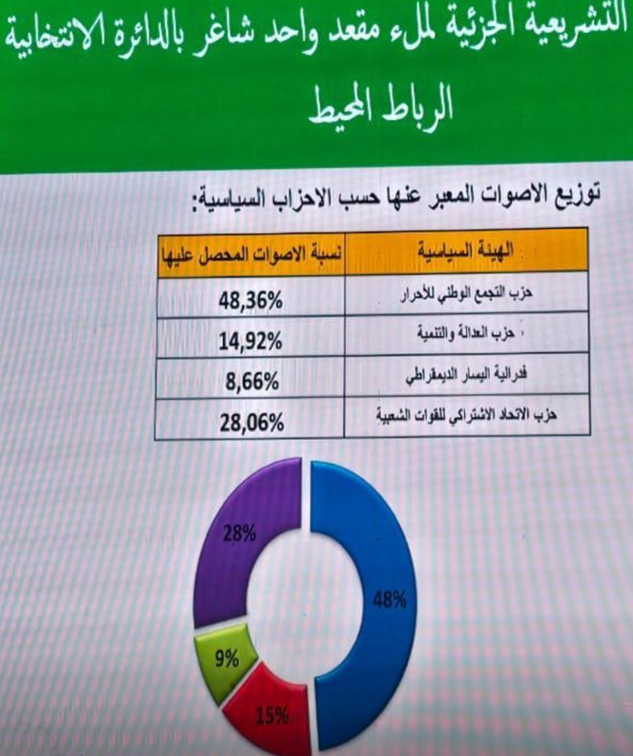 وحسب مصدر الموقع، فان النتائج الأولية المؤقتة التي أعلن عنها الكاتب العام عمالة الرباط، فإن مرشح حزب التجمع الوطني للأحرار حصل على نسبة 48،36 في المائة من الأصوات المعبر عنها، يليه حزب الاتحاد الاشتراكي للقوات الشعبية 28،6 في المائة، ثم حزب العدالة والتنمية 14،92 في المائة، ثم فدرالية اليسار الديموقراطي 8،66 في المائة.