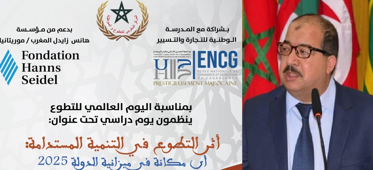 ينظم المركز المغربي للتطوع والمواطنة، بشراكة مع المدرسة الوطنية للتجارة والتسيير بعين السبع، وبدعم من مؤسسة هانس زايدل، يوما دراسيا بمناسبة اليوم العالمي للتطوع حول : ” أثر التطوع في التنمية المستدامة … أي مكانة في ميزانية الدولة 2025 ” وذلك يوم الأربعاء 11 دجنبر 2024، ابتداء من الساعة التاسعة ونصف صباحا، برحاب المدرسة الوطنية للتجارة والتسيير – عين السبع – الدار البيضاء.