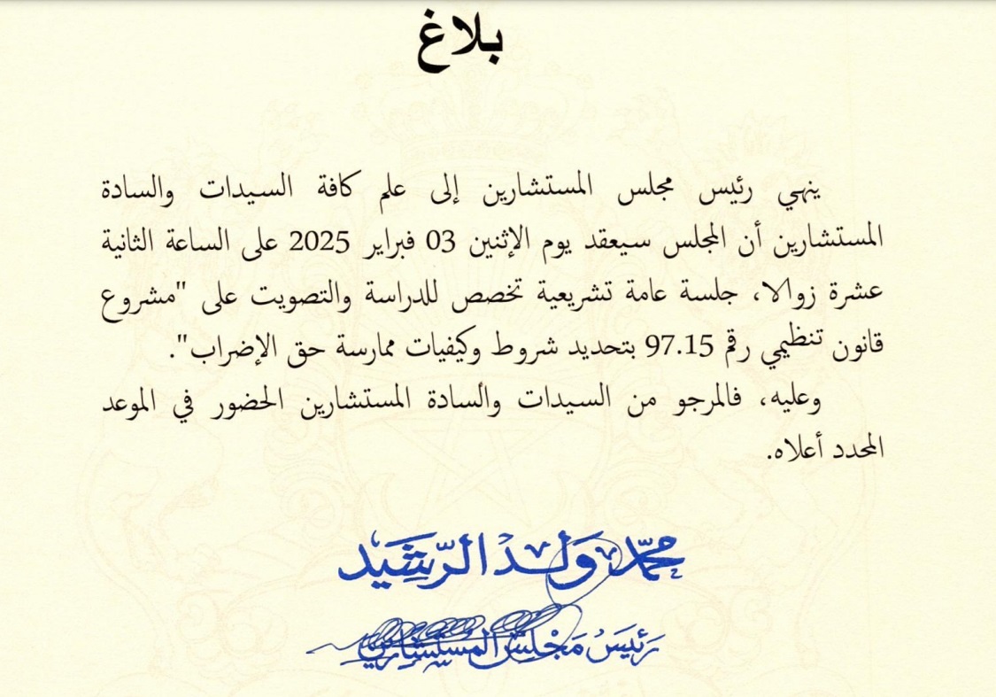 يعقد مجلس المستشارين يوم الإثنين 3 فبراير 2025 جلسة عامة تشريعية تخصص للدراسة والتصويت على مشروع قانون تنظيمي رقم 97.15 بتحديد شروط وكيفيات ممارسة حق الإضراب.