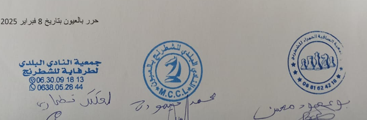 على إثر الأخبار المتداولة والتي تفيد تأسيس عصبة جهوية للشطرنج تجمع بين جهات العيون الساقية الحمراء والداخلة وادي الذهب وكلميم واد نون يوم السبت 8 فبراير 2025 ، التأم السادة رؤساء الاندية الرياضية لشطرنج لجهة العيون الساقية الحمراء الموقعين اسفله، لتدارس هاته الواقعة التي شقت صف اندية الشطرنج بالجهات الثلاث، وبعد تدارس النقاط التي كانت مطروحة على جدول الاعمال.