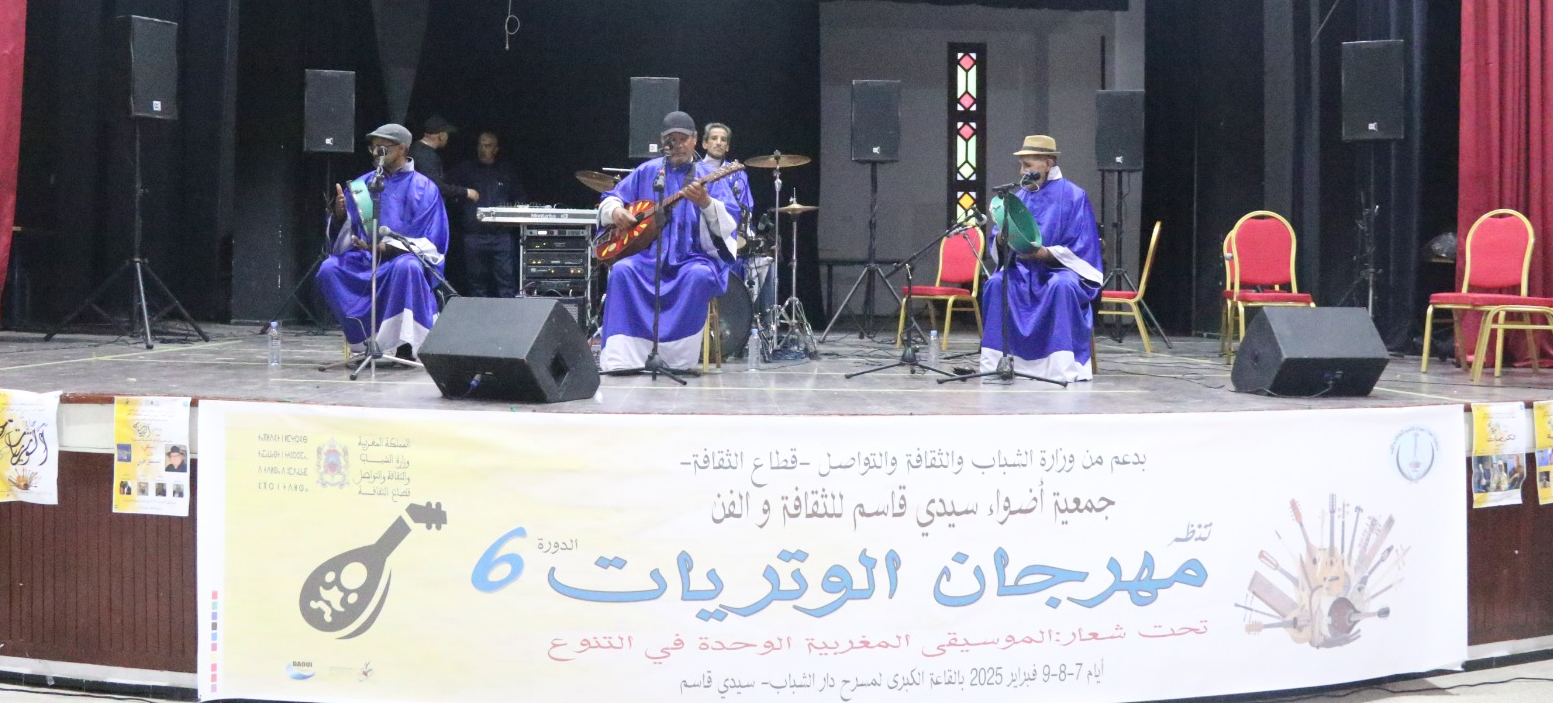 بدعم من وزارة الشباب والثقافة والتواصل قطاع الثقافة ،نظمت جمعية أضواء سيدي قاسم للثقافةوالفن النسخةالسادسة لمهرجان الوتريات أيام 7و8 و9 فبراير 2025 بسيدي قاسم تحت شعار ” الموسيقى المغربية الوحدة في التنوع ” .