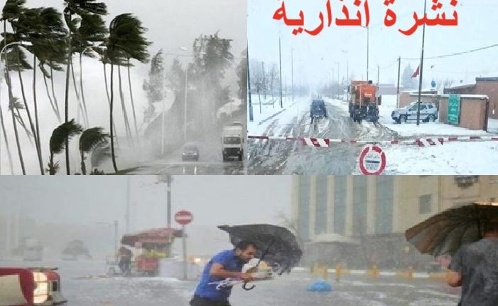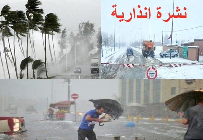 أفادت المديرية العامة للأرصاد الجوية بأن تساقطات ثلجية (20-70 سم) على المرتفعات التي تتجاوز 1500 متر، وأمطارا قوية وأحيانا رعدية مع تساقط محلي للبر د (30-150 ملم)، وهبات رياح قوية مع تطاير محلي للغبار (70-95 كلم/س)، مرتقبة من اليوم السبت إلى بعد غد الاثنين بعدد من مناطق المملكة.