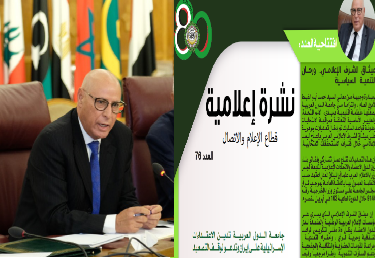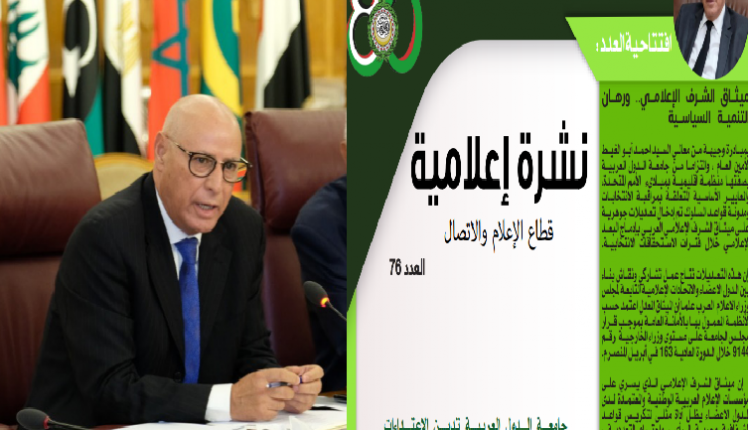 اصدر قطاع الاعلام بجامعة الدول العربية، نشرة إعلامية في عددها 76، التي يشرف عليها السفير احمد رشيد خطابي الأمين العام المساعد، رئيس قطاع الاعلام والاتصال، والذي تطرق في افتتاحيتها الى ميثاق الشرف الاعلامي .. ورهان التنمية السياسية، وفيما يلي ما جاء فيها: