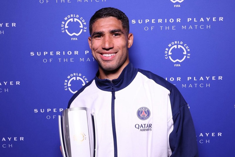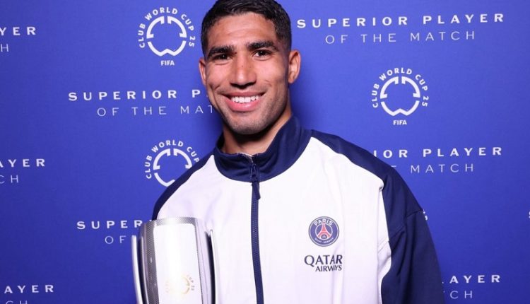 توج الدولي المغربي أشرف حكيمي ،أمس الاثنين ،بجائزة أفضل لاعب في المباراة التي جمعت فريقه باريس سان جيرمان وسياتل ساوندرز الأمريكي برسم الجولة الثالثة من دور المجموعات لكأس العالم للأندية لكرة القدم المقامة بالولايات المتحدة.