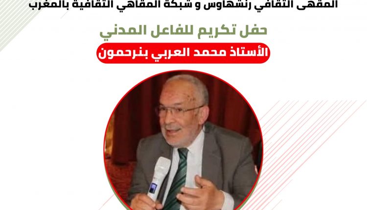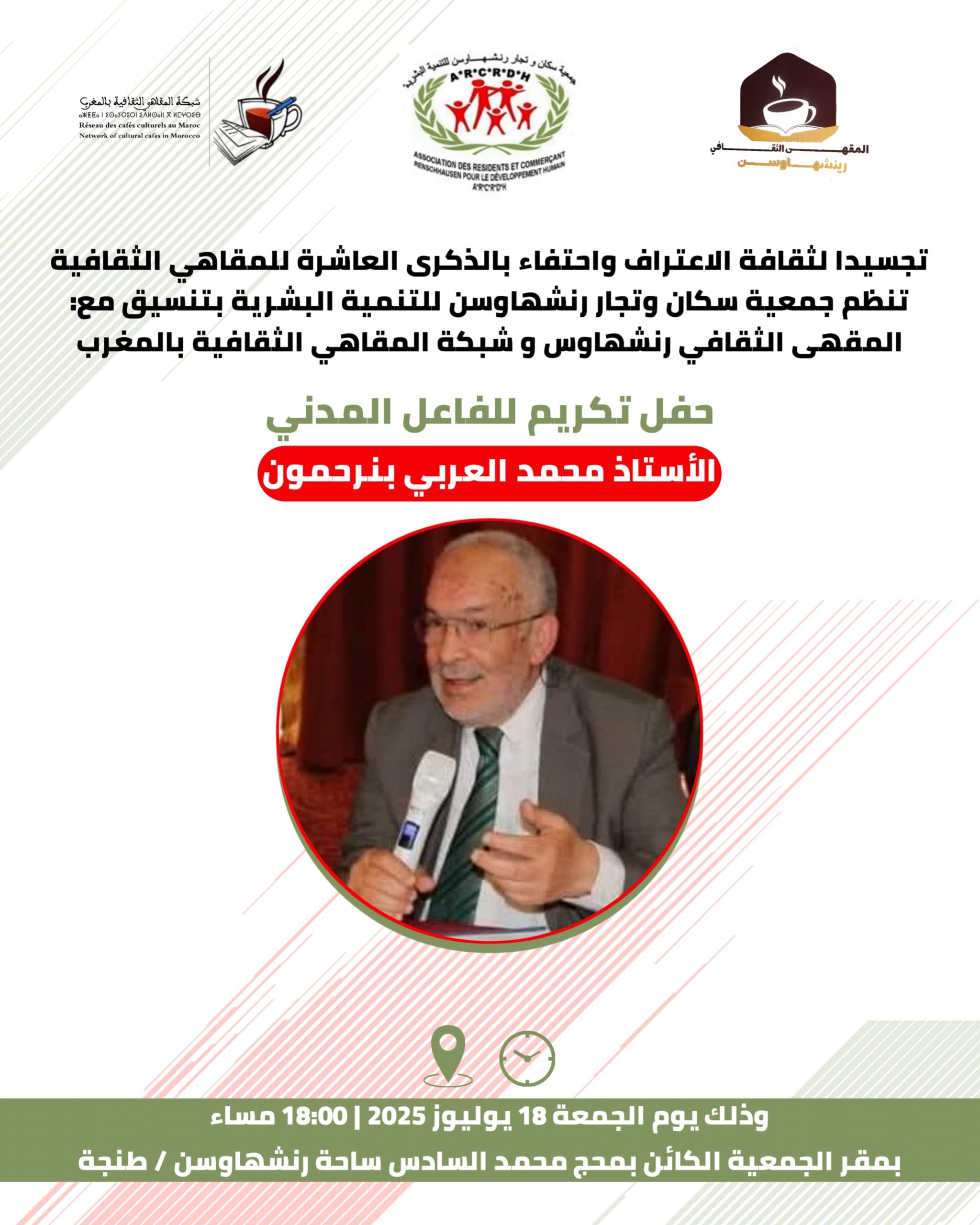 تخليدا لثقافة الإعتراف واحتفاء بالذكرى العاشرة لتأسيس شبكة المقاهي الثقافية بالمغرب ، تنظم جمعية سكان وتجار رنشهاوسن للتنمية البشرية والمقعدهى الثقافي رنشهاوسن ، وبتنسيق مع شبكة المقاهي الثقافية بالمغرب ، حفل تكريم الفاعل المدني محمد العربي بنرحمون يوم الجمعة 18يوليوز 2025 على الساعة السادسة مساء بمقهى رنشهاوسن الكائن بمحج محمد السادس بمدينة طنجة.