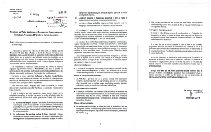 تنفيذا للتوجيهات الملكية السامية الواردة في خطاب العرش ليوم 29 يوليوز 2025 ، وجه وزير الداخلية، عبد الوافي لفتيت، مذكرة رسمية إلى ولاة الجهات وعمال عمالات أقاليم وعمالات المقاطعات، يدعو من خلالها إلى الشروع، دون تأخير، في إعداد جيل جديد من برامج التنمية الترابية المندمجة.
