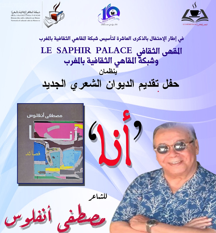 في إطار الإحتفال بالذكرى العاشرة لتأسيسها، تنظم شبكة المقاهي الثقافية بالمغرب ، والمقهى الثقافي “لوسافير بلاص ” حفل تقديم الديوان الشعري الجديد ” أنا ” للشاعر مصطفى أنفلوس وذلك يوم الخميس 9 أكتوبر 2025 على الساعة السادسة مساء بمقهى le saphir palace بئر الرامي الشرقية بالقنيطرة .