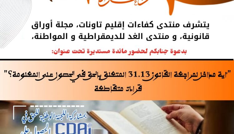 في إطار انفتاحهم على قضايا الحكامة الجيدة والشفافية وتعزيز حق المواطن في الوصول إلى المعلومة، ينظم منتدى كفاءات إقليم تاونات و منتدى الغد للمواطنة ومجلة “أوراق قانونية” مائدة مستديرة حول موضوع:أية مداخل لمراجعة القانون 31.13 المتعلق بالحق في الحصول على المعلومات“،وذلك يوم الخميس 16 أكتوبر 2025، على الساعة الرابعة بعد الزوال بمقر المنتدى الكائن: 4 زنقة طرابلس – الشقة 3- حسان /الرباط .