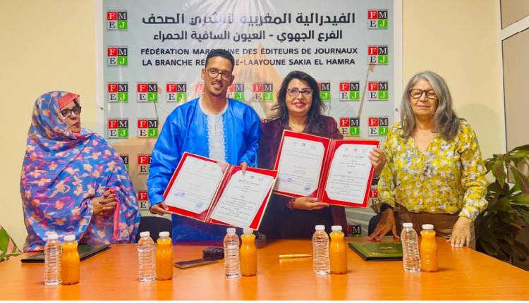 تم امس السبت 8 نونبر الجاري بمدينة العيون، التوقيع على اتفاقية تعاون وشراكة بين الفيدرالية المغربية لناشري الصحف – فرع جهة العيون الساقية الحمراء ورابطة كاتبات المغرب وإفريقيا، خلال حفل رسمي احتضنه مقر الفيدرالية بالمدينة، بحضور شخصيات إعلامية وثقافية.