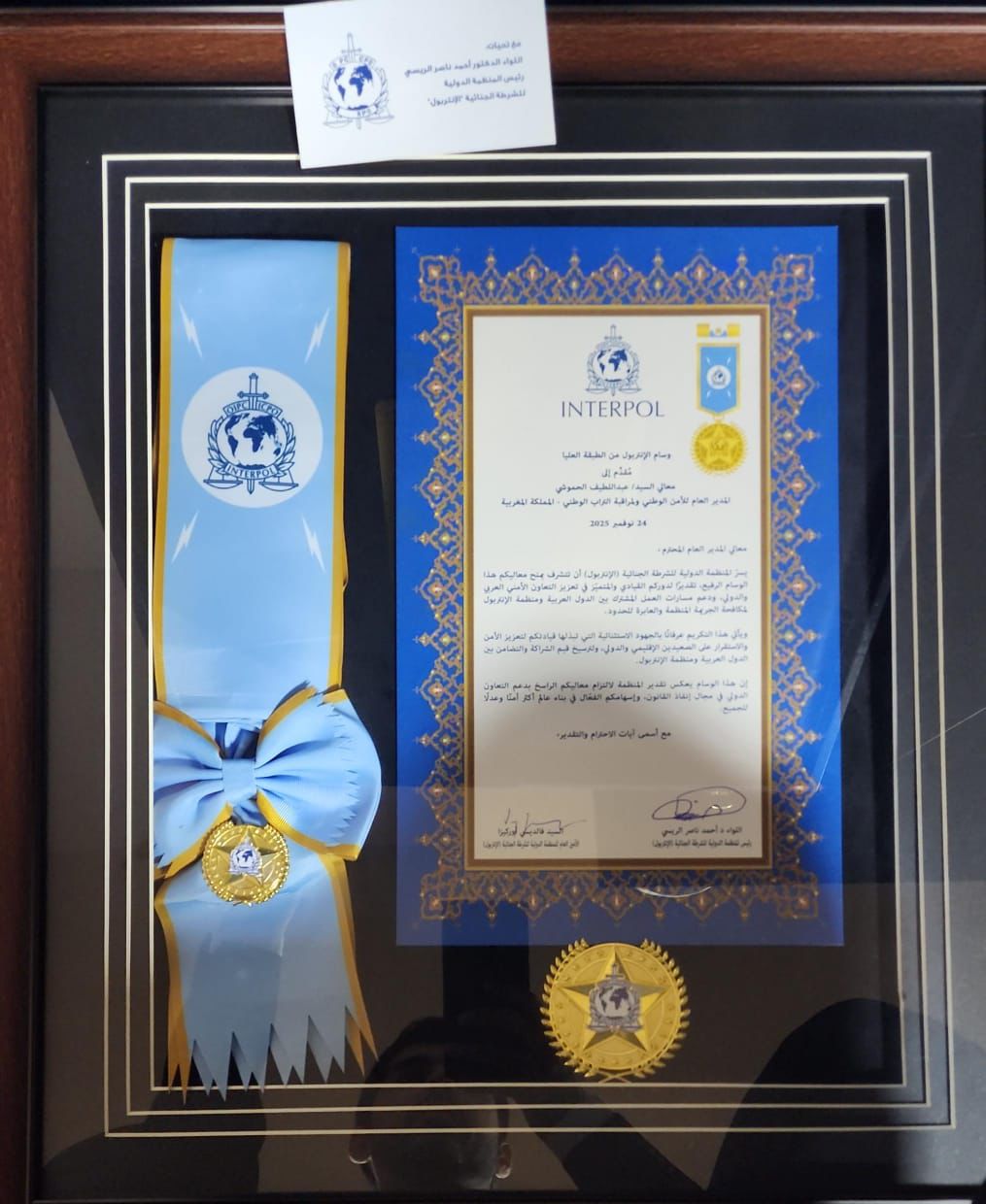 وشحت المنظمة الدولية للشرطة الجنائية أنتربول السيد عبد اللطيف حموشي، المدير العام للأمن الوطني ولمراقبة التراب الوطني، بوسام الأنتربول من الطبقة العليا، الذي يعد أرفع وسام تصدره المنظمة لسامي الشخصيات الدولية.