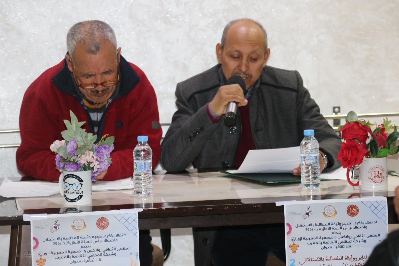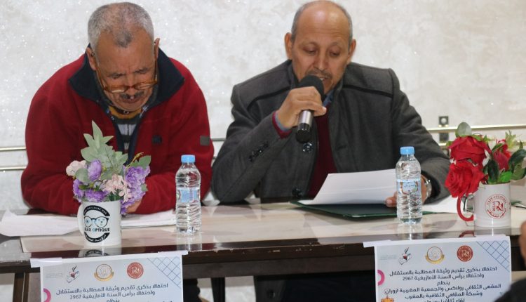 تحت شعار إيض نناير وذكرى تقديم وثيقة المطالبة بالإستقلال شاهدان على وحدة الوطن، نظم المقهى الثقافي رولاكس بورزازات، والجمعية المغربية إزوران للثقافة والإبداع بتنسيق مع شبكة المقاهي الثقافية بالمغرب ،إحتفالية بمناسبة ذكرى تقديم وثيقة المطالبة بالاستقلال وبرأس السنة الأمازيغية 2967 ،إيض نناير .هذا النشاط الثقافي الذي حضره نخبة من الأدباء والشعراء والمهتمين ،حيث افتتح الحفل بتحية العلم الوطني ،تلته مداخلتين الأولى بعنوان” ذكرى تقديم وثيقة الاستقلال درس من دروس الماضي و شاهد على وحدة وقوة المغاربة “،حيث أكد المتدخل محمد أبومضا على كون الأرض التي أنجبت المقاومة ،أنجبت أيضا التعايش والوحدة وحب الوطن ،وأن التعدد الثقافي قوة وطنية لاتقسم . كما تعرض الدكتور حدو ختوش في مداخلته إلى الدلالات التاريخية لرأس السنة الأمازيغية ،معرجا على ارتباط الأمازيغ بالأرض ،كما قدم نماذج من الأشعار التي ظلت ترافق الأمازيغ في أفراحهم ومسراتهم .. وكذلك إبان الحروب و المعارك التي خاضها المغاربة ضد المعمرين، وقدم نماذج من الأشعار التي أنشدت في معركة لهري وبادو وبوݣافر… ،كما أمتع الحاضرين بإنشاده المتميز